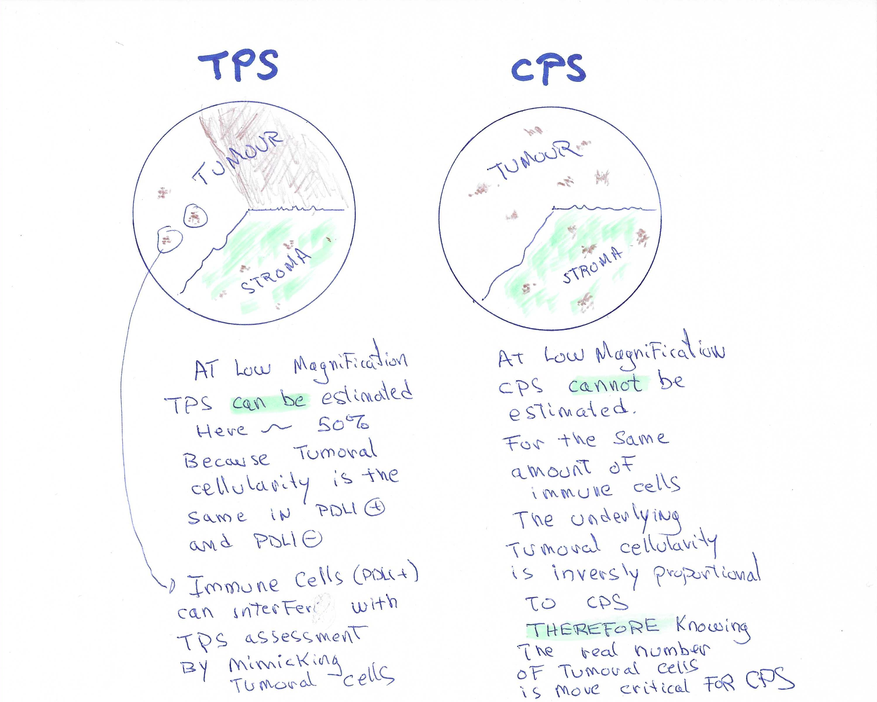 CPS and TPS are quite different in their approaches. Regarding the assessment TPS, one challenge is the detection of weakly stained tumoural cells. Sometimes a subset will be strongly positive and can sidetrack our focus from another weakly stained subset. Immune cells must be ignored in the TPS assessment and sometimes macrophages mimic tumoral cells and one has to review the associated H&E. CPS has different challenge. While TPS can be estimated from visual assessment of stained vs non-stained proportions, this is not possible for CPS. Indeed the “area” of immune positive cells and the “area” of tumour are de-correlated in term of cellularity.