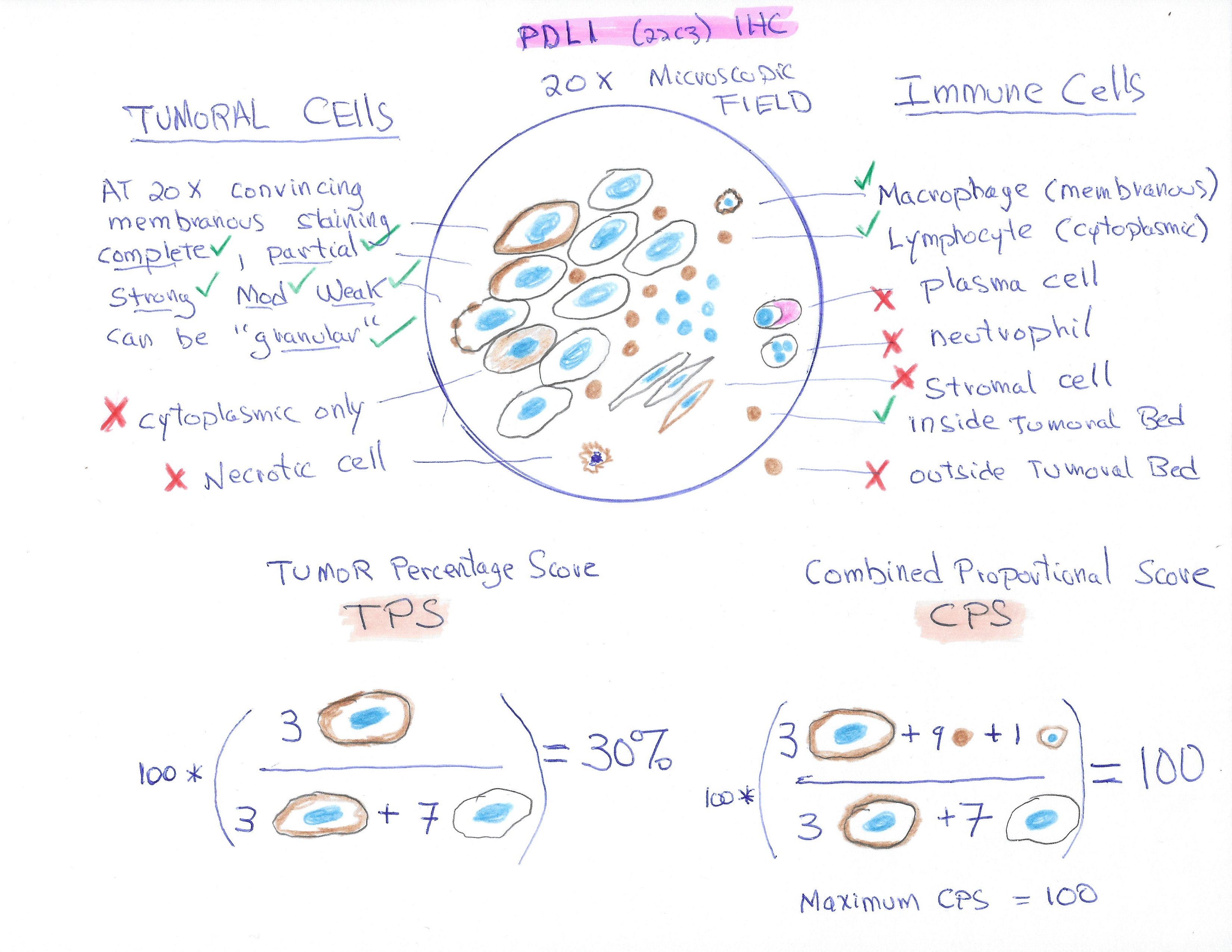 Assessing either TPS and CPS is not straightforward. Different scenario are encountered which trigger different strategies to properly assessed this PDL1 biomarker. Here are examples of scenario
